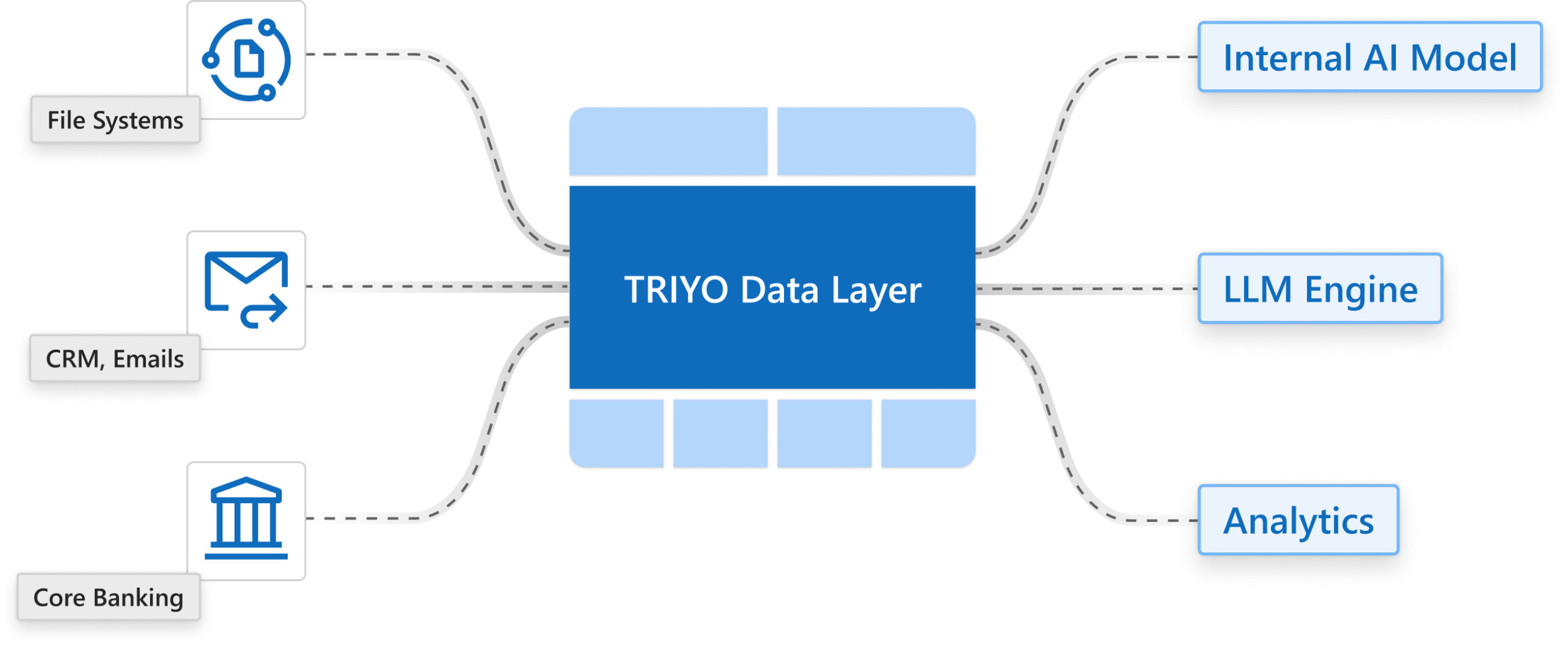 By overlaying legacy systems, TRIYO extracts and structures operational data into governed data lakes. Institutions gain a scalable, secure foundation for internal AI models and advanced analytics.