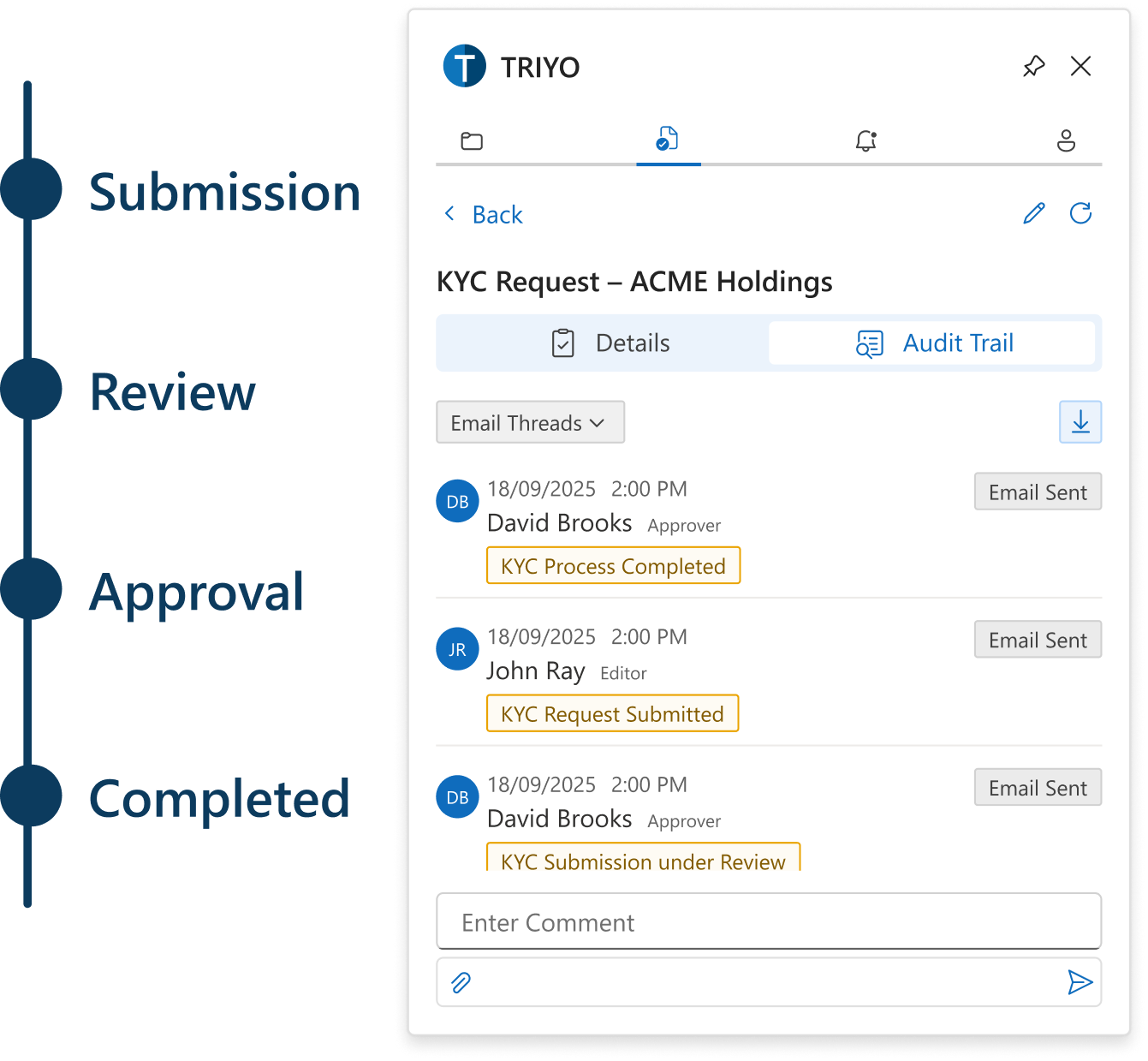 Gain a 360° view of every KYC request from initiation to approval. Instantly identify delayed submissions, view communication history, and track progress across stakeholders. Every email reply, update, and action is logged automatically, giving you a complete audit trail and full confidence in compliance accuracy.